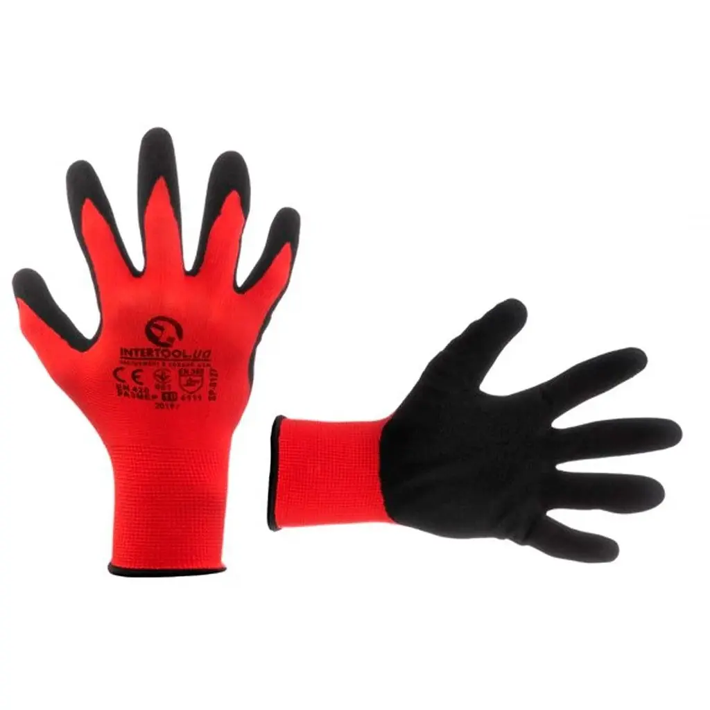 Рукавички SP-0127 виготовлені із синтетичного волокна червоного кольору та пов'язані безшовним методом. Покриті сірим пористим нітрилом на долоні, що забезпечує стійкіший захист рук від забруднень при проведенні побутових, будівельних та садових робіт. Стійкі до стирання та мають тривалий термін експлуатації. Повітропроникна основа створює додатковий комфорт. Розмір: 10"; В'язка: 13 петель на 1", безшовна; Покриття: нітрил; Манжет: в'язаний