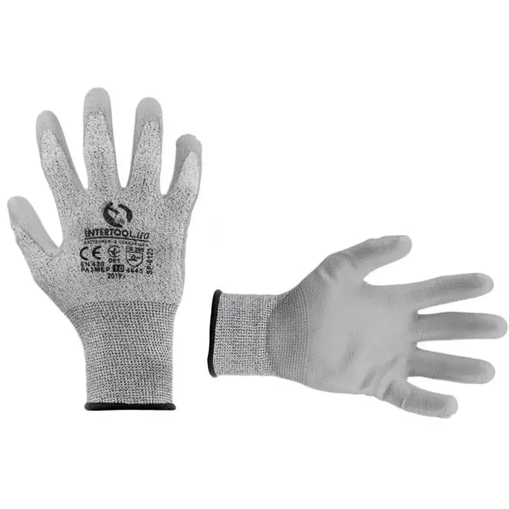 Спеціальні рукавички із захистом від порізів - з високотехнологічного матеріалу, що надійно захищає ваші руки від порізів гострими предметами, спеціальне покриття долоні гарантує надійний контакт зі слизькими поверхнями. Ідеальне рішення при роботах з листовим металом, а також при слюсарних та складських роботах. Розмір: 10"; В'язка: 13 петель на 1", безшовна дюйм; Покриття: поліуретан