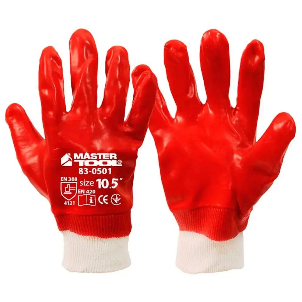 Рукавички кислотостійкі, бавовняний трикотаж, повне ПВХ покриття, в'язаний манжет (червоні). Висока стійкість до розривів та проколів, еластичні навіть за низьких температур. Підходять для захисту від кислот та лугів.