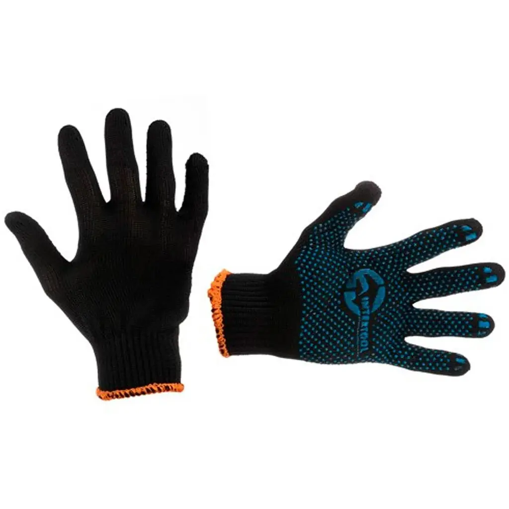 Рукавички SP-0104 синтетичні трикотажні синього кольору. На долоні нанесено точкове покриття ПВХ, що забезпечує захист рук і надійне захоплення предметів. З еластичними манжетами, які м'яко прилягають до кисті та запобігають попаданню побутового та будівельного сміття всередину рукавичок. Призначені для виконання будівельних та сільськогосподарських робіт, ручних механозбірних робіт. Розмір: 9"; В'язка: 7 петель на 1", безшовна; Манжет: в'язаний з окантовкою; Покриття: блакитні ПВХ точки на долоні