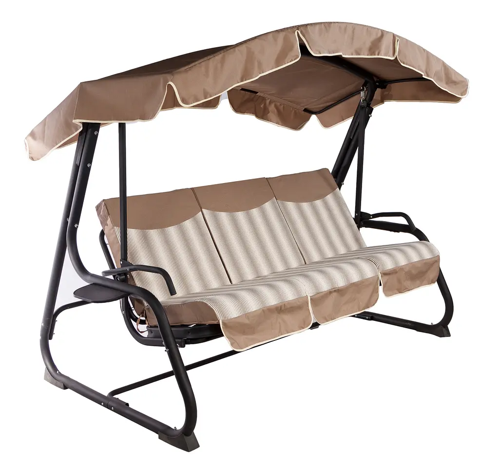 Кут нахилу тенту (нахил вгору-вниз) регулюється бічними фіксаторами на даху. Гойдалки комплектуються: матрацом, тканинним тентом. Оббивка матраца і тент виготовлені з тканини тексілк. Ця тканина спеціально розроблена для вуличних меблів і має такі переваги: