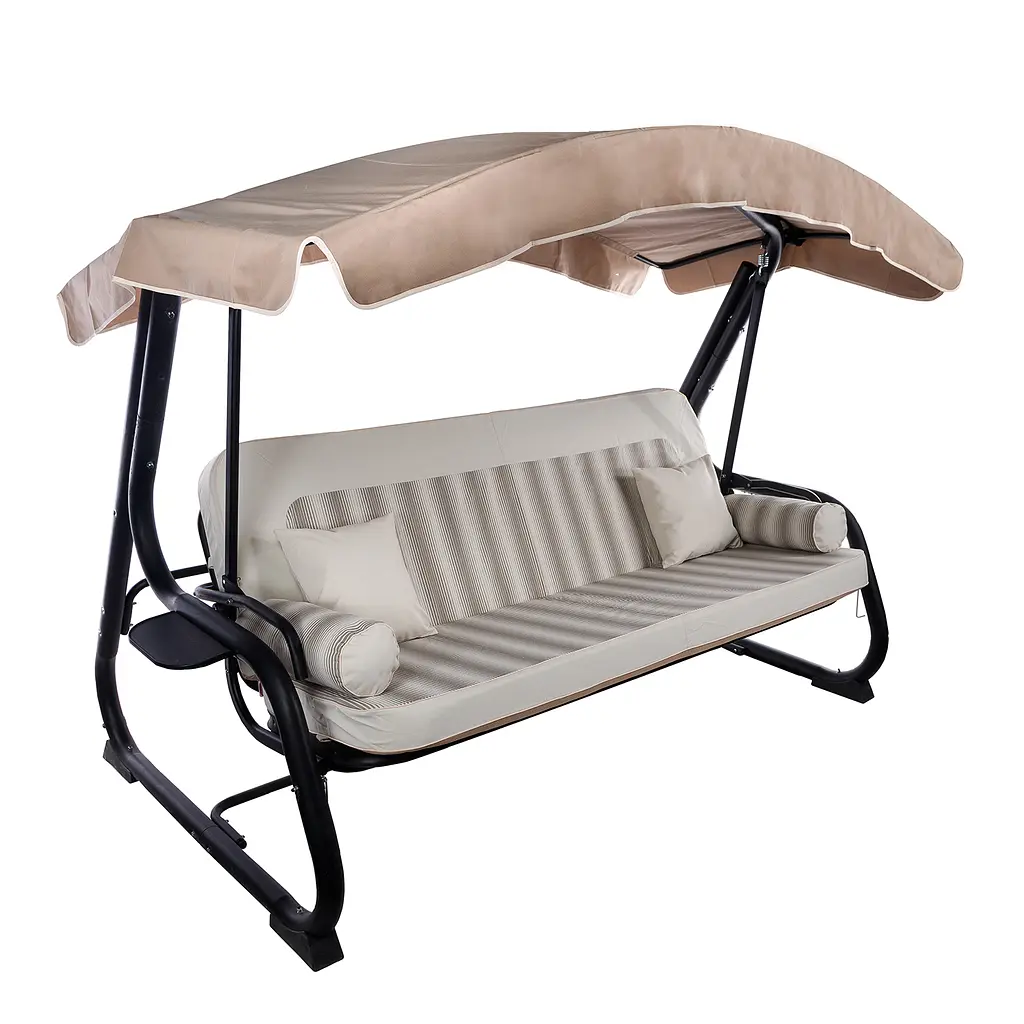 Кут нахилу тенту (нахил вгору-вниз) регулюється бічними фіксаторами на даху. Гойдалка комплектується: матрацом, тканинним тентом, подушками - 2 шт., валиками - 2 шт.