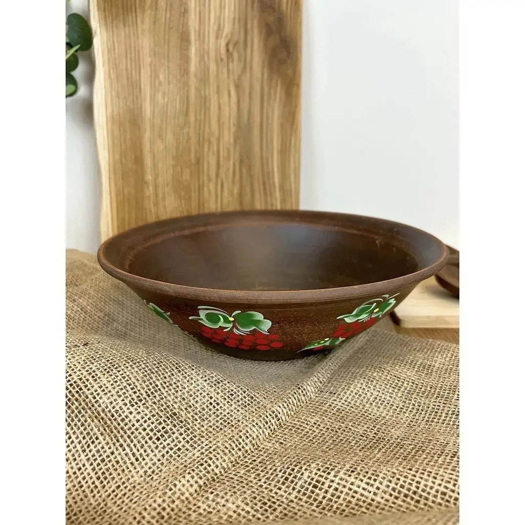 Великий салатник об'ємом 2,5 літра з розписом "Калина" - ідеальне рішення для святкового або повсякденного сервірування. Виготовлений з натуральної глини і покритий харчовою глазур'ю. Традиційний орнамент калини символізує красу і достаток, надаючи сервіруванню особливого українського настрою.