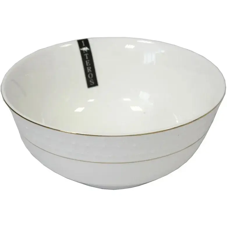 Салатник виготовлений з високоякісної порцеляни, що надає йому благородного білого кольору, гладкої поверхні та виняткової міцності. Його дизайн вирізняється класичною білою основою з тонкою золотою облямівкою по краю та рельєфним візерунком у вигляді геометричних зірок або сніжинок по зовнішньому периметру, що створює ефект "снігової королеви" і надає посуду особливого шарму.