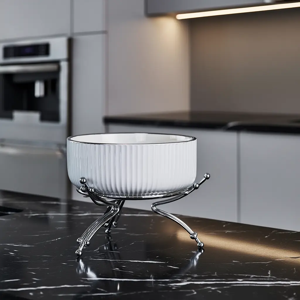 Елегантна порцелянова салатниця на металевій підставці стане стильним елементом сервірування та зручним рішенням для подавання салатів, закусок або фруктів. Поєднання білосніжної порцеляни та металу створює гармонійний контраст, який підкреслить як повсякденний, так і святковий стіл.