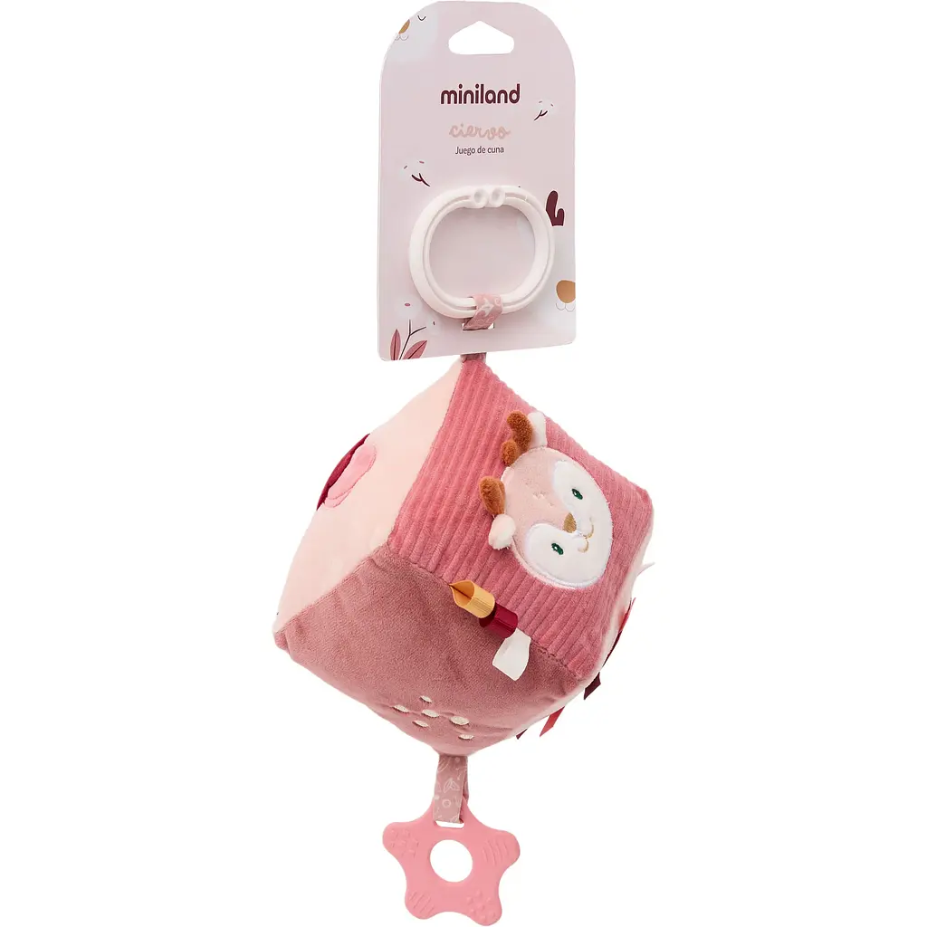 Сенсорний підвісний кубик Miniland Baby Deer - м'яка підвіска у вигляді оленяти, що легко кріпиться на ліжечко, коляску або автокрісло. Підходить для малюків з самого народження і робить перші сенсорні ігри комфортними і захоплюючими.