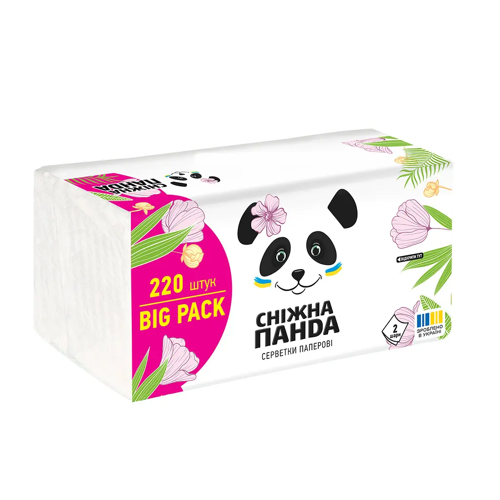 Серветки паперові 2 шари Сніжна Панда BigPack поліетилен 220 шт. - це практичний продукт від українського бренду Сніжна Панда, призначений для щоденного використання та догляду, доступний для покупки в Україні. Виготовлені з двошарової м’якої целюлози, серветки міцні, добре вбирають вологу та підходять для обличчя та рук, включаючи дитячу шкіру. Упаковка BigPack із поліетилену містить 220 штук стандартного розміру (приблизно 20x20 см), що забезпечує зручність і економічність.