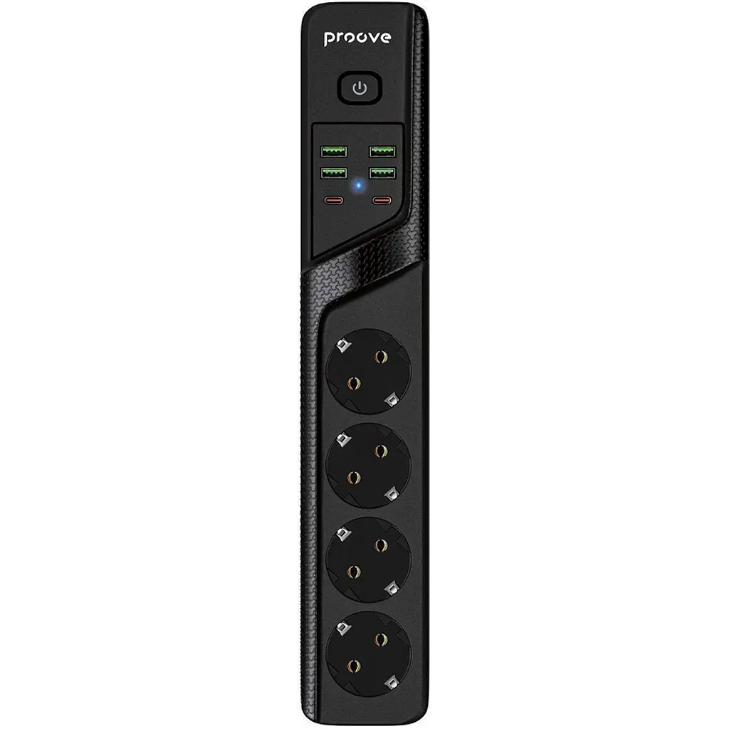 Мережевий фільтр Proove Power Socket P-04 - це універсальний пристрій, який поєднує в собі 4 стандартні розетки змінного струму, 4 USB-A та 2 порти USB-C. Така конфігурація дозволяє одночасно підключати різноманітні пристрої, від побутової техніки до мобільних гаджетів, забезпечуючи зручність та ефективність у використанні.