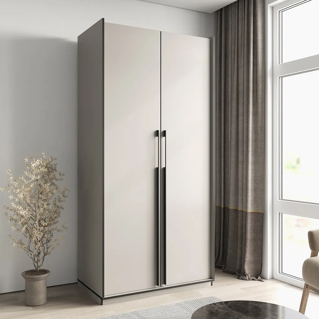 Шафа для дому - це зручна і функціональна шафа для зберігання речей та інших предметів. Виготовлений з ЛДСП, що забезпечує довговічність та міцність конструкції. Шафа оснащена штангою для зручного розміщення речей. Дверцята оснащені петлями з доводчиком, що забезпечує плавне закривання. Чорна фурнітура та металеві ручки надають шафі стильного та сучасного вигляду. Чорна кромка товщиною 1 мм надає виробу додаткової міцності та захищає від пошкоджень. Кріплення на рафіксах та мініфіксах забезпечує надійність конструкції. На антресолях використовуються типони.
