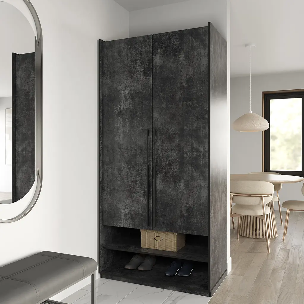 Ця шафа для одягу є стильним і функціональним рішенням для організації зберігання вашого одягу. Він оснащений поличками за двома дверима із металевими ручками та чорною фурнітурою. Петлі з дотягувачами забезпечують плавне закривання дверей. Кріплення на рафіксах та мініфіксах забезпечує надійну конструкцію.Чорна кромка завтовшки 1 мм надає шафі елегантного вигляду. Виготовлена з ЛДСП, ця шафа має міцну і довговічну конструкцію.