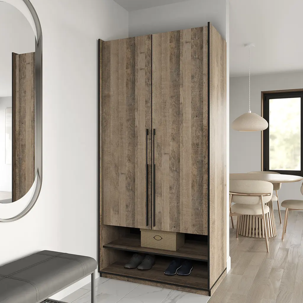Ця шафа для одягу є стильним і функціональним рішенням для організації зберігання вашого одягу. Він оснащений поличками та штангою для зручного розміщення одягу, за двома дверима із металевими ручками та чорною фурнітурою. Петлі з дотягувачами забезпечують плавне закривання дверей. Кріплення на рафіксах та мініфіксах забезпечує надійну конструкцію. Чорна кромка завтовшки 1 мм надає шафі елегантного вигляду. Виготовлена з ЛДСП, ця шафа має міцну і довговічну конструкцію.