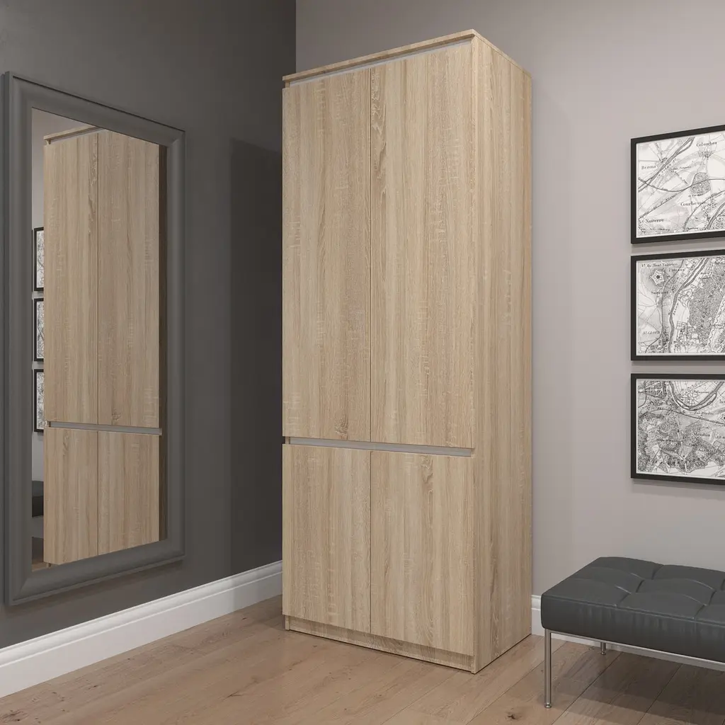 Шафа для одягу Vays R-10 - функціональне рішення для спальні, вітальні чи передпокою. Оснащена штангою для вішаків та полицями, ідеально підходить для зберігання одягу та аксесуарів. Мінімалістичний дизайн без ручок додає сучасності, а міцна конструкція з ЛДСП гарантує довговічність. Компактні розміри дозволяють розмістити шафу навіть у невеликому приміщенні.