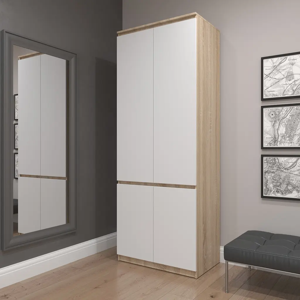 Шафа для одягу Vays R-10 - функціональне рішення для спальні, вітальні чи передпокою. Оснащена штангою для вішаків та полицями, ідеально підходить для зберігання одягу та аксесуарів. Мінімалістичний дизайн без ручок додає сучасності, а міцна конструкція з ЛДСП гарантує довговічність. Компактні розміри дозволяють розмістити шафу навіть у невеликому приміщенні.
