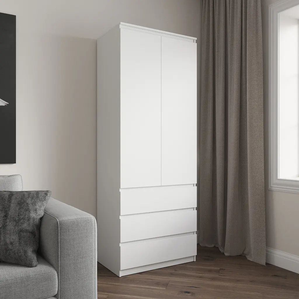 Модель оснащена трьома місткими шухлядами та зручними полицями, що дозволяє зручно організувати зберігання одягу, білизни та побутових речей. Виготовлена з якісного ЛДСП, шафа має стійку конструкцію і довговічне покриття, стійке до подряпин та впливу вологи.
