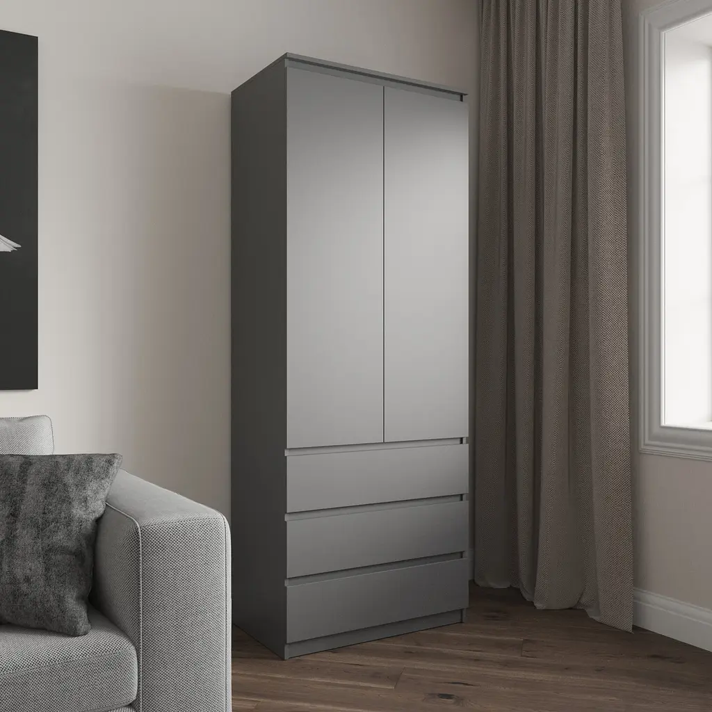 Модель оснащена трьома місткими шухлядами та зручними полицями, що дозволяє зручно організувати зберігання одягу, білизни та побутових речей. Виготовлена з якісного ЛДСП, шафа має стійку конструкцію і довговічне покриття, стійке до подряпин та впливу вологи.