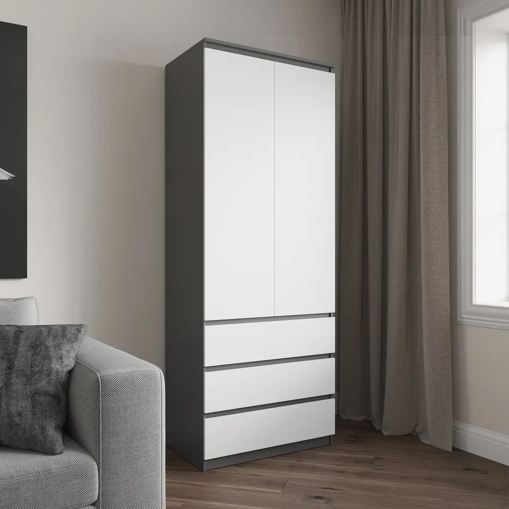 Шафа для одягу Vays R-16 - це сучасне та функціональне рішення для зберігання речей у спальні, вітальні чи передпокої. Завдяки лаконічному дизайну без ручок, меблі ідеально вписуються в інтер’єр у стилі мінімалізм, модерн чи скандинавський.