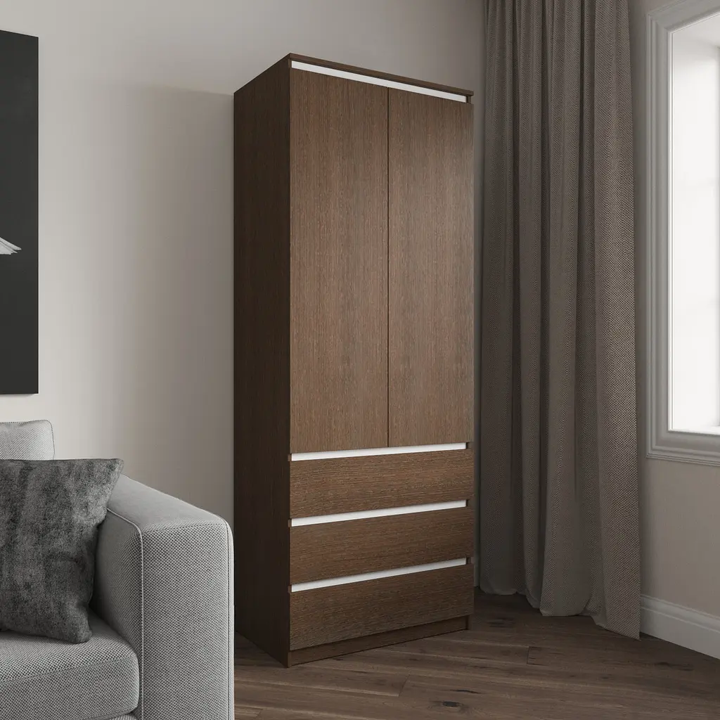 Модель оснащена трьома місткими шухлядами та зручними полицями, що дозволяє зручно організувати зберігання одягу, білизни та побутових речей. Виготовлена з якісного ЛДСП, шафа має стійку конструкцію і довговічне покриття, стійке до подряпин та впливу вологи.