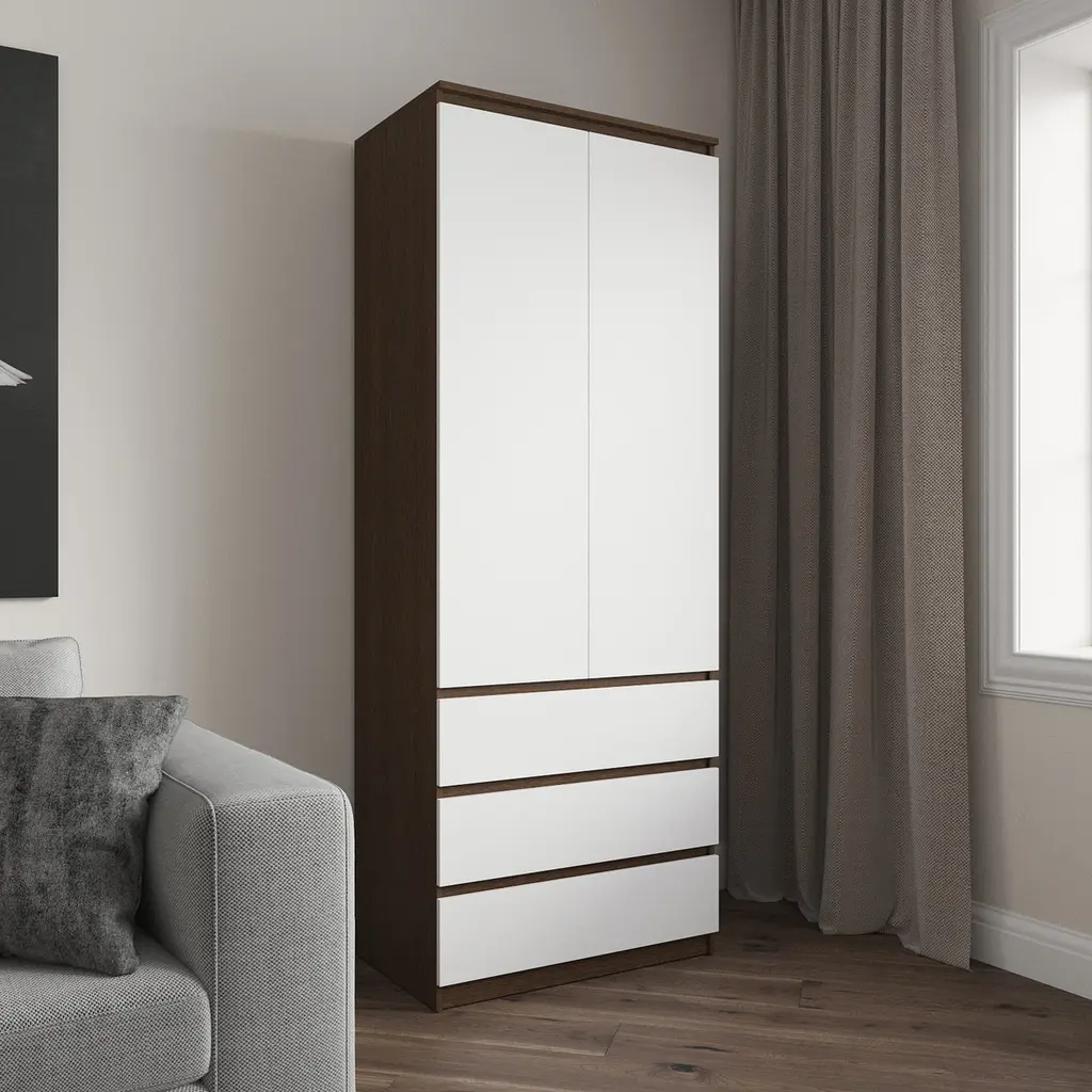 Шафа для одягу Vays R-16 - це сучасне та функціональне рішення для зберігання речей у спальні, вітальні чи передпокої. Завдяки лаконічному дизайну без ручок, меблі ідеально вписуються в інтер’єр у стилі мінімалізм, модерн чи скандинавський.