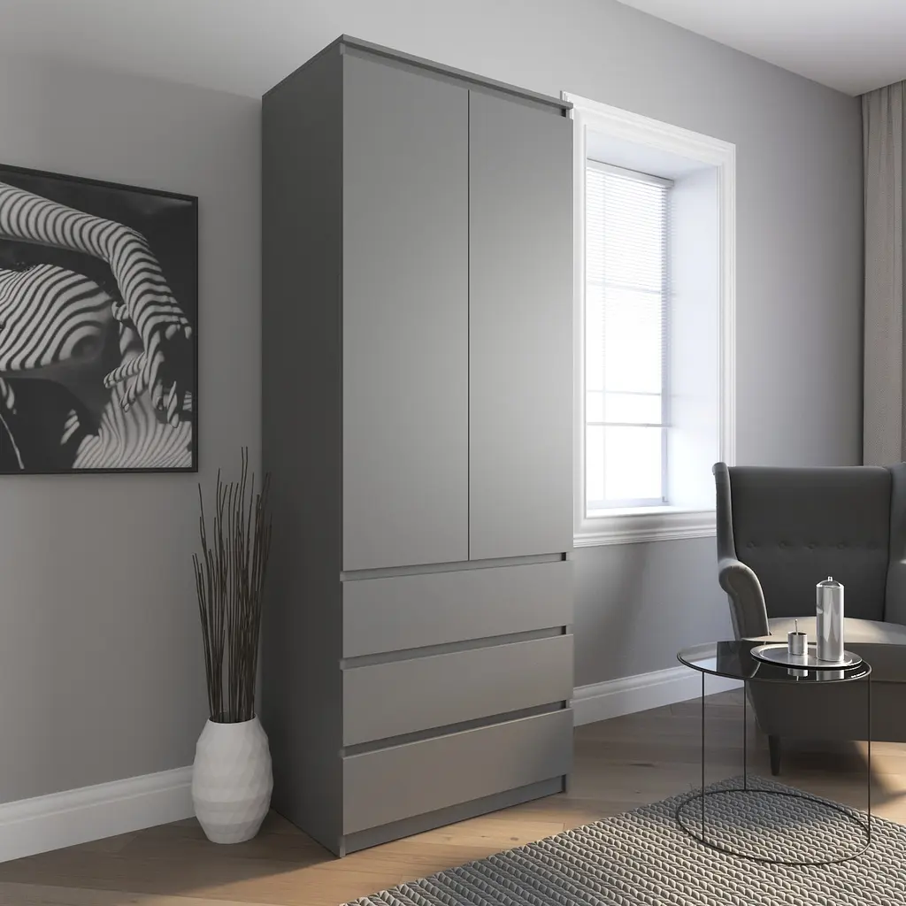 Шафа для одягу Vays R-9 - функціональне рішення для спальні, вітальні чи передпокою. Оснащена 3 місткими шухлядами та штангою для вішаків, ідеально підходить для зберігання одягу та аксесуарів. Мінімалістичний дизайн без ручок додає сучасності, а міцна конструкція з ЛДСП гарантує довговічність. Компактні розміри дозволяють розмістити шафу навіть у невеликому приміщенні.