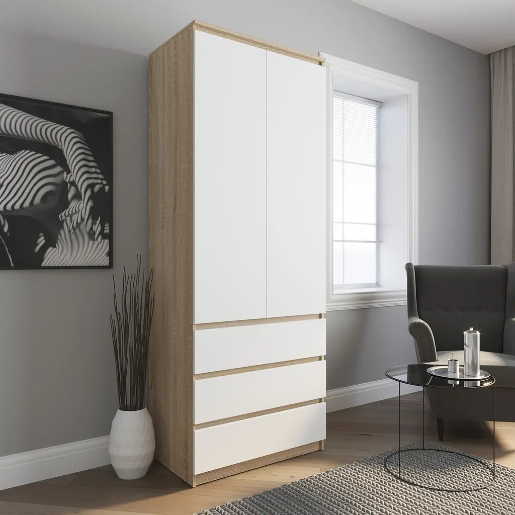Шафа для одягу Vays R-9 - функціональне рішення для спальні, вітальні чи передпокою. Оснащена 3 місткими шухлядами та штангою для вішаків, ідеально підходить для зберігання одягу та аксесуарів. Мінімалістичний дизайн без ручок додає сучасності, а міцна конструкція з ЛДСП гарантує довговічність. Компактні розміри дозволяють розмістити шафу навіть у невеликому приміщенні.