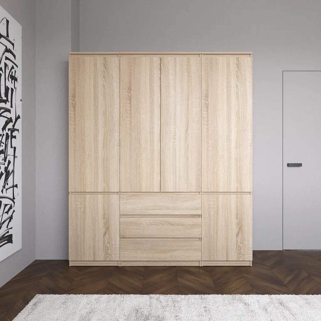 Шафа зі штангою та полицями, комплект з 2 пеналів з полицями та 1 шафа зі штангою для одягу з 3 шухлядами R9+R22-2