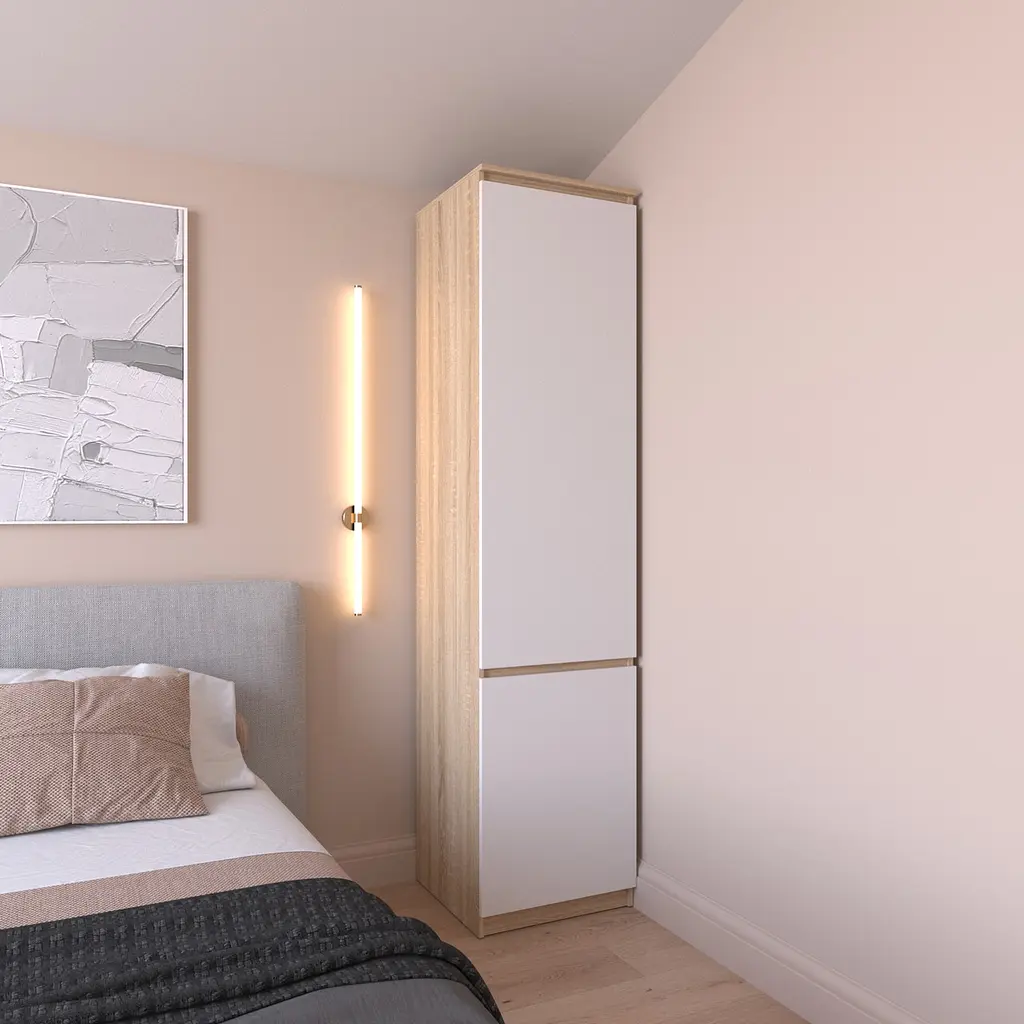 Шафа пенал Vays R-22 - функціональне рішення для організації зберігання в спальні, передпокої чи гардеробній. Завдяки компактним габаритам 50×50×211 см, модель ідеально підходить для невеликих приміщень, забезпечуючи водночас достатньо місця для одягу, білизни та інших речей. Усередині передбачені практичні полиці для впорядкованого зберігання. Стильний фасад без ручок додає виробу сучасного вигляду та гармонійно вписується в мінімалістичний інтер’єр. Виготовлена з міцного ЛДСП, шафа вирізняється довговічністю, легкістю в догляді та надійною конструкцією. Ідеальний вибір для поціновувачів лаконічного дизайну та функціональності.