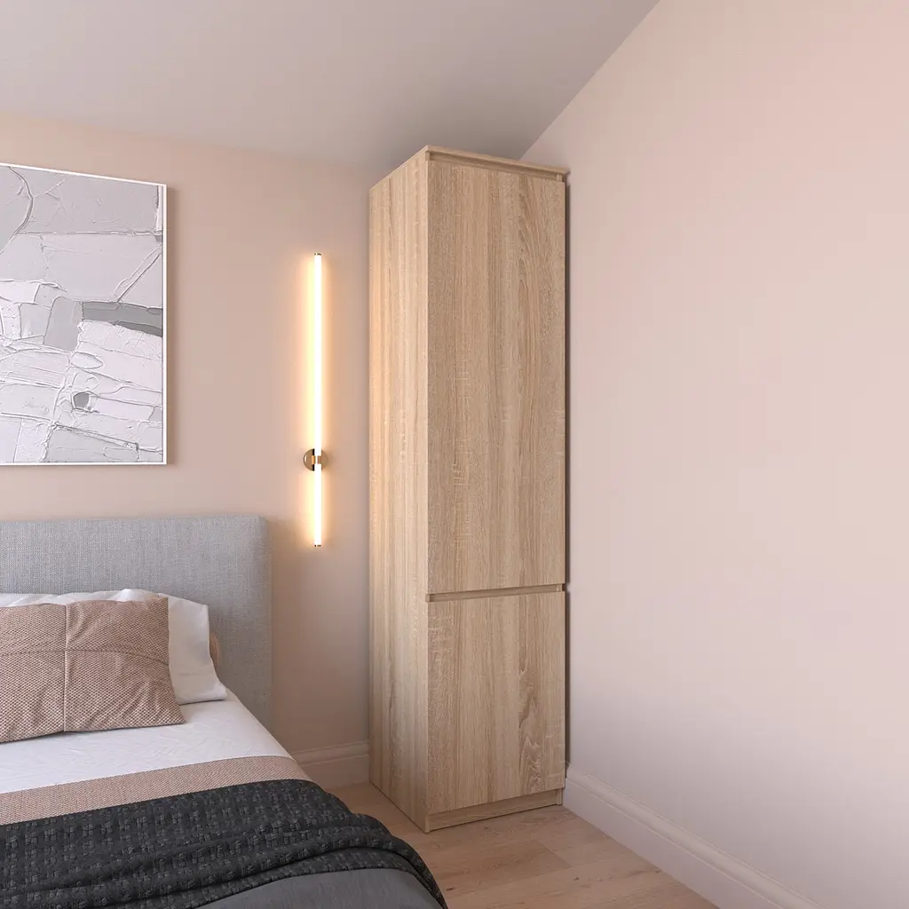 Шафа пенал Vays R-22 - функціональне рішення для організації зберігання в спальні, передпокої чи гардеробній. Завдяки компактним габаритам 50×50×211 см, модель ідеально підходить для невеликих приміщень, забезпечуючи водночас достатньо місця для одягу, білизни та інших речей. Усередині передбачені практичні полиці для впорядкованого зберігання. Стильний фасад без ручок додає виробу сучасного вигляду та гармонійно вписується в мінімалістичний інтер’єр. Виготовлена з міцного ЛДСП, шафа вирізняється довговічністю, легкістю в догляді та надійною конструкцією. Ідеальний вибір для поціновувачів лаконічного дизайну та функціональності.