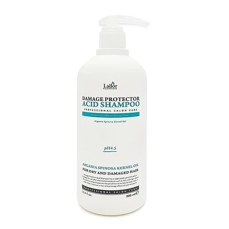 Безлужний шампунь з pH 4.5 La'dor Damage Protector Acid Shampoo ефективно відновлює кислотно-лужний баланс і надійно захищає інтенсивність кольору ваших локонів.