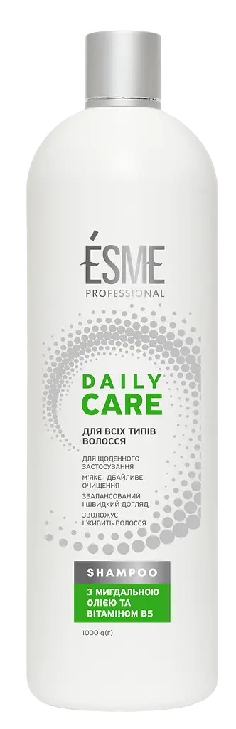 Шампунь Esme (Есмі) Daily Care - забезпечує ефективне, але водночас максимально дбайливе очищення, нейтралізуючи жорсткість води та оберігаючи гідроліпідний баланс шкіри голови.