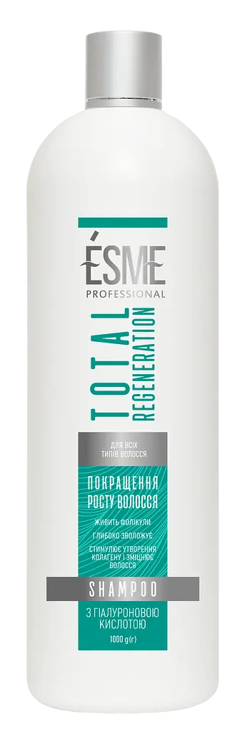 Шампунь Esme (Есмі) Total Regeneration з гіалуроновою кислотою - живить фолікули, сприяє покращенню циркуляції крові та обміну речовин у шкірі, що позитивно впливає на ріст волосся.