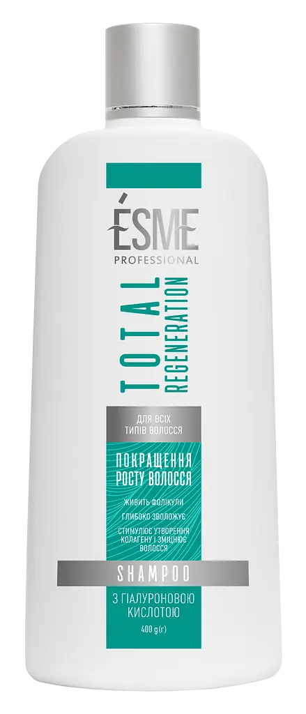 Шампунь Esme (Есмі) Total Regeneration з гіалуроновою кислотою - живить фолікули, сприяє покращенню циркуляції крові та обміну речовин у шкірі, що позитивно впливає на ріст волосся.