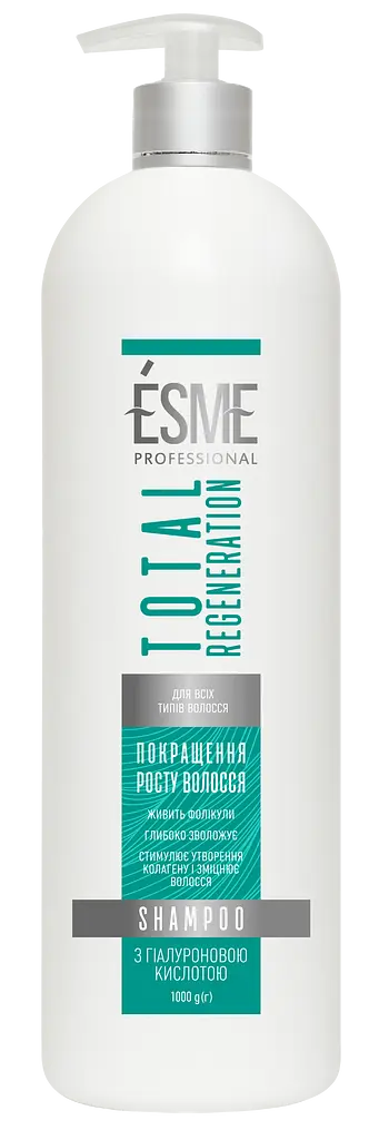Шампунь з дозатором Esme (Есмі) Total Regeneration з гіалуроновою кислотою - живить фолікули, сприяє покращенню циркуляції крові та обміну речовин у шкірі, що позитивно впливає на ріст волосся.