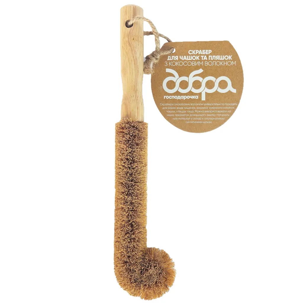 Щітка виготовлена з натурального кокосового волокна, що забезпечує м'якість і високу ефективність очищення без пошкодження поверхні. Ергономічна ручка дозволяє зручніше працювати, навіть з великими або вузькими посудинами.