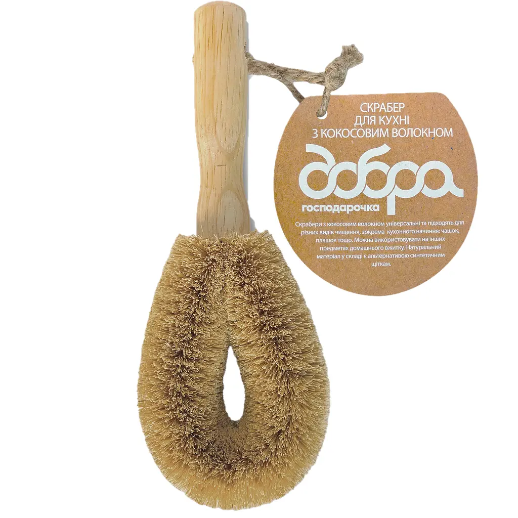 Щітка виготовлена з натурального кокосового волокна, що забезпечує високу ефективність у видаленні бруду, при цьому не пошкоджує поверхню посуду або продуктів. Це відмінний вибір для тих, хто піклується про навколишнє середовище та шукає екологічно чисті продукти для домашнього використання.