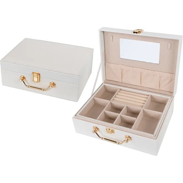 Внутрішній простір шкатулки розділений на кілька відділень, що дозволяє організовано зберігати кільця, сережки, браслети та інші аксесуари. М’яка оббивка захищає прикраси від подряпин і пошкоджень, забезпечуючи їх безпечне зберігання. Надійна застібка та стильна ручка додають практичності, дозволяючи легко переносити шкатулку. Це прекрасний вибір для тих, хто цінує комфорт і стиль, а також ідеальний подарунок для близьких.