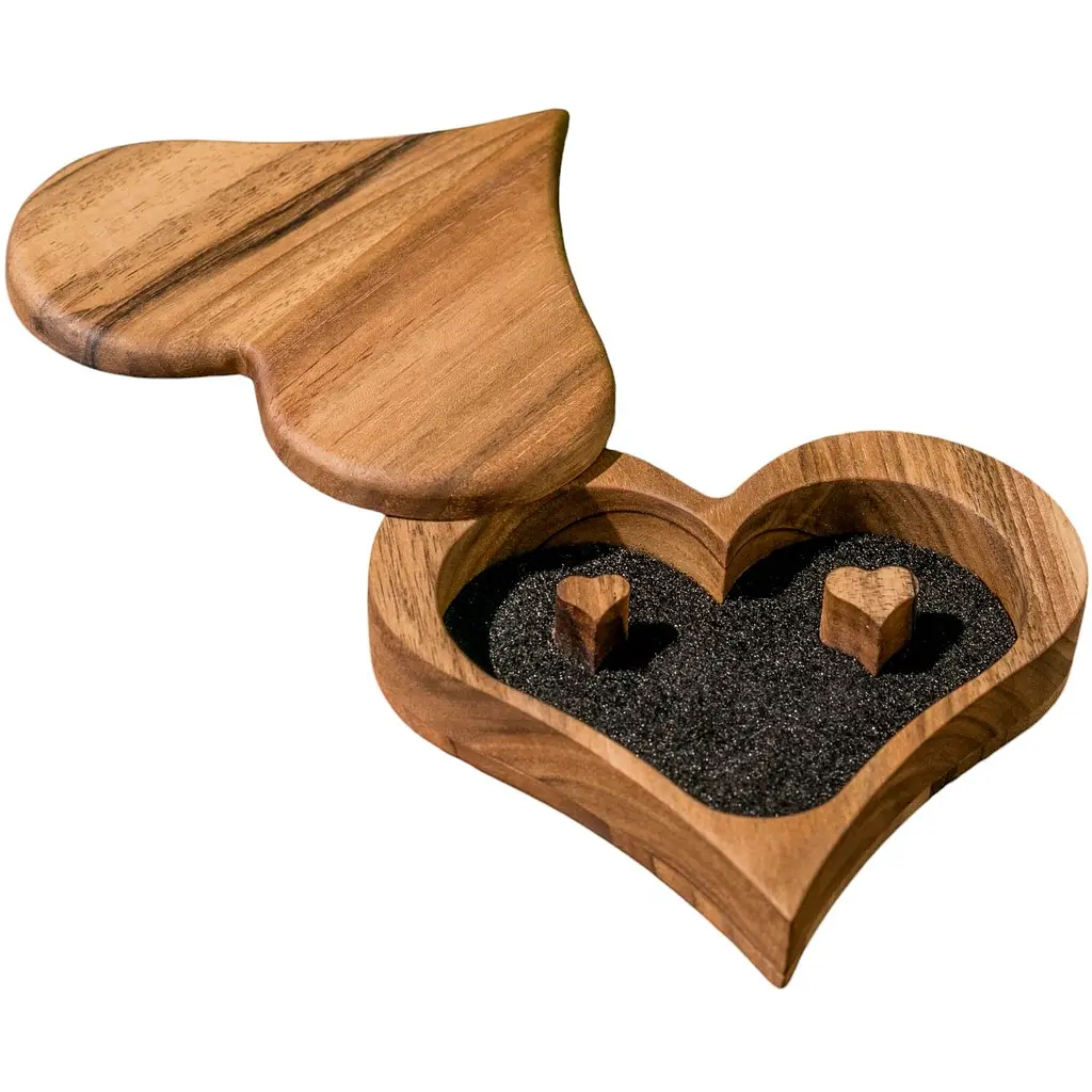 Скринька для каблучок ручної роботи у формі серця зроблена з якісного шматка твердої деревини волоського горіха, що надає особливої цінності цьому виробу.