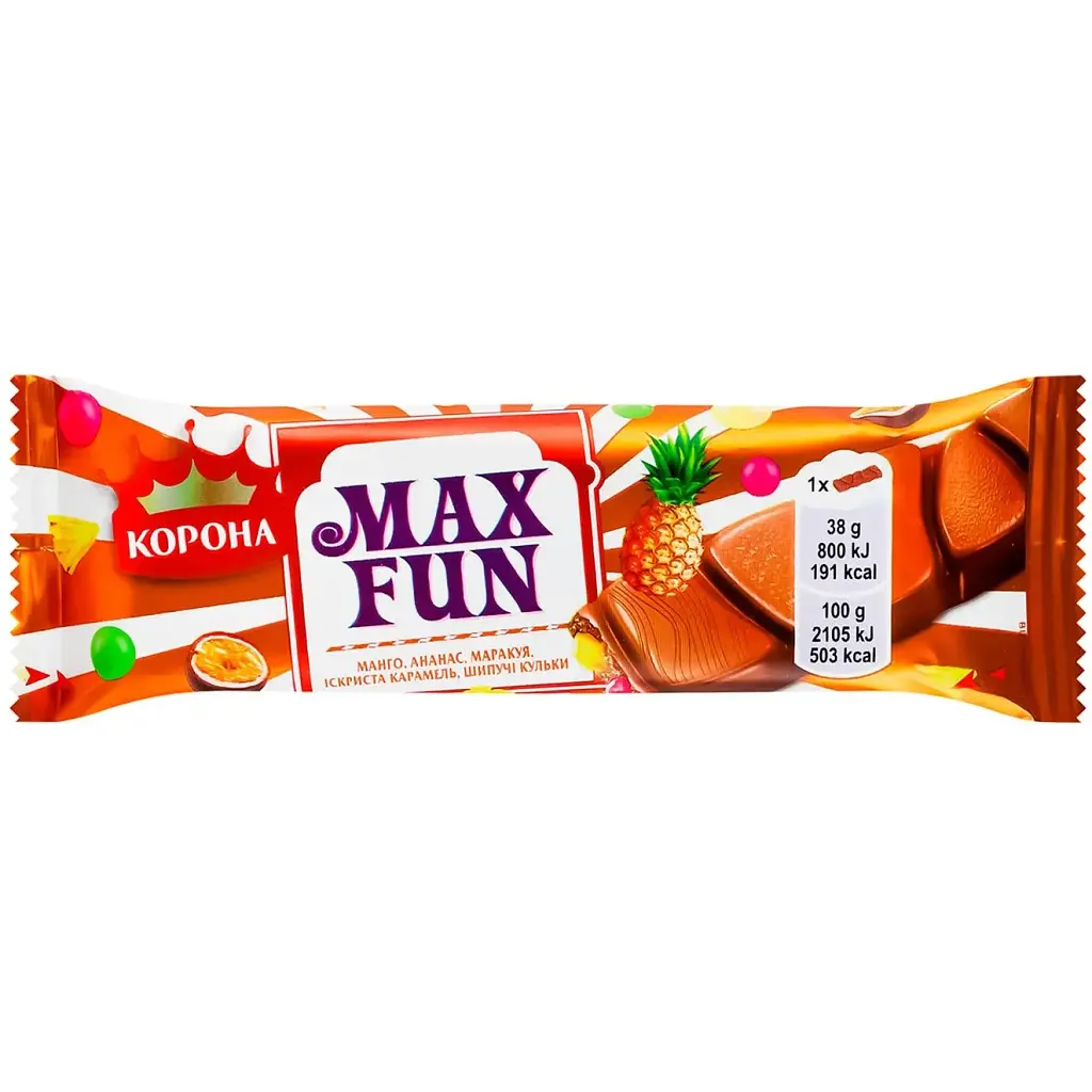 Шоколад Корона Max Fun - це унікальне поєднання класичного молочного шоколаду та яскравих фруктових смаків. Шматочки манго, ананаса та маракуї додають екзотичну солодкість, а шипучі рисові кульки створюють ефект бульбашок у роті, що робить кожен шматочок цікавим і несподіваним. Вибухова карамель додає інтенсивного смакового акценту, завершуючи незвичайне смакове відчуття.