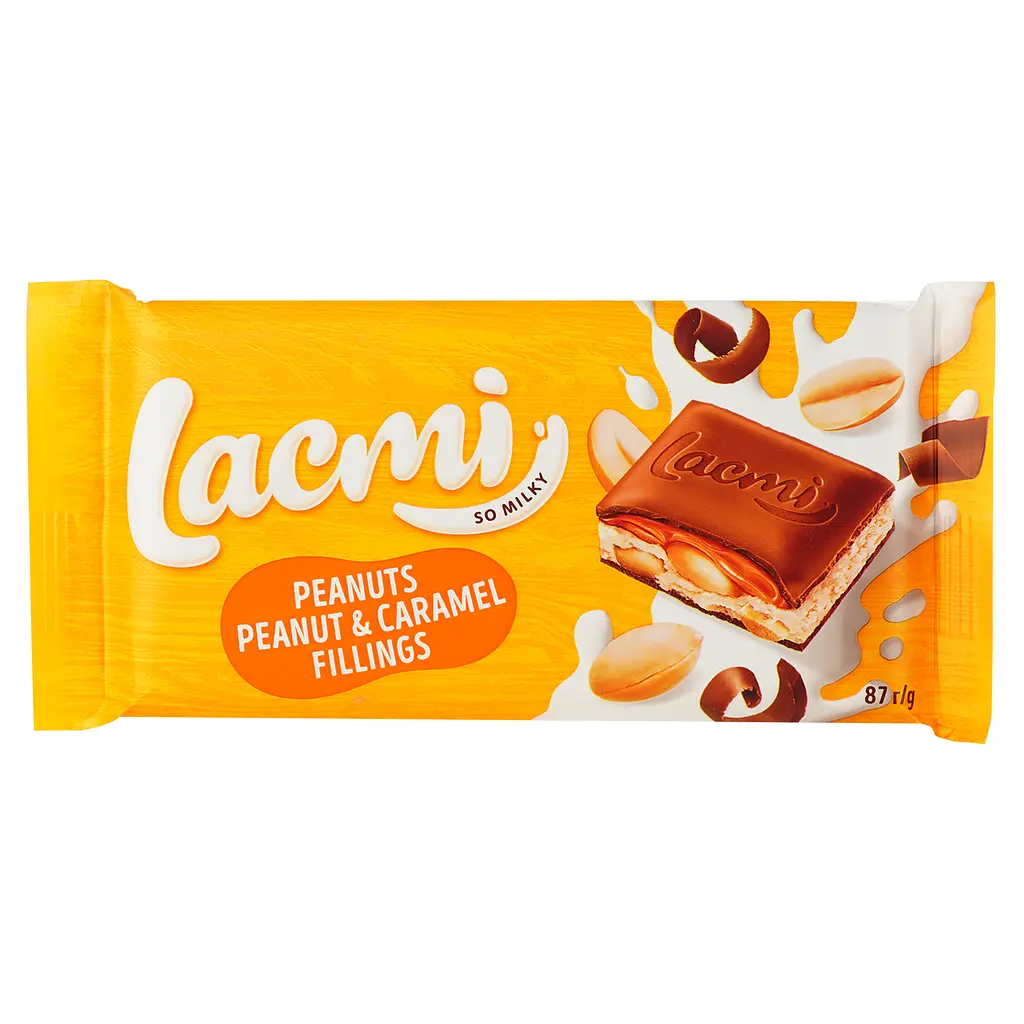 Молочний шоколад Roshen Lacmi Peanuts з начинкою арахісу та карамелі має ніжну текстуру та гармонійне поєднання солодкого і горіхового смаку. Начинка м’яка та ароматна, що робить продукт приємним для солодкого перекусу.