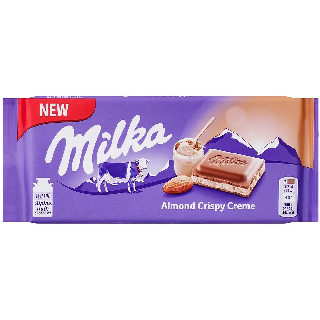Шоколад молочний Мilka з кремово-мигдальною начинкою має унікальну рецептуру з додаванням справжнього альпійського молока, яке робить шоколад таким неповторним. Ніжний класичний молочний шоколад із кремово-мигдальною начинкою. Незрівнянний смак здатний перенести в чарівну країну, де завжди бездонне блакитне небо, яскраве сонце, чисті струмки, зелена трава та бузкові мрії.