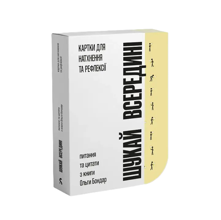 52 картки-провідники до себе, створені на основі книжки Ольги Бондар "Шукай всередині". Це не просто набір карток. Це маленька щоденна практика, що повертає до себе - до того тихого внутрішнього голосу, який ми чуємо лише тоді, коли нарешті сповільнюємося. У комплекті 52 картки, поділені на два блоки:Цитати з книги "Шукай всередині" - ясні, влучні фрази, які здаються простими, але чомусь довго не відпускають. Питання - глибокі, чесні, іноді гострі. Ті, що допомагають перестати тікати від себе і подивитися всередину без страху. Картки можна використовувати по одній, у ранковій практиці, у вечірній рефлексії, на вихідних, у терапії, у команді чи в парі. Вони працюють завжди, з досвідом або без, незалежно від настрою та стану. Ці картки - про спостереження, усвідомлення й маленькі чесні розмови із собою. Про ті запитання, які ми зазвичай відкладаємо "до кращого моменту", але саме вони рухають нас уперед.