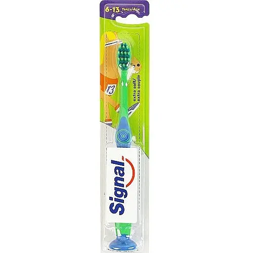 Дитяча зубна щітка Signal Kids 6-13 Years Toothbrush створена спеціально для дітей шкільного віку та забезпечує дбайливий і ефективний догляд за зубами. М’які щетинки ретельно очищають емаль і міжзубні проміжки, не подразнюючи чутливі ясна. Зручна ергономічна ручка добре лежить у дитячій руці та допомагає комфортно чистити зуби щодня. Яскравий дизайн робить процес гігієни цікавішим і мотивує дитину регулярно доглядати за ротовою порожниною. Щітка підходить для молочних і постійних зубів у період їх зміни. Рекомендовано використовувати двічі на день разом із дитячою зубною пастою для підтримання здорової усмішки та свіжого подиху.