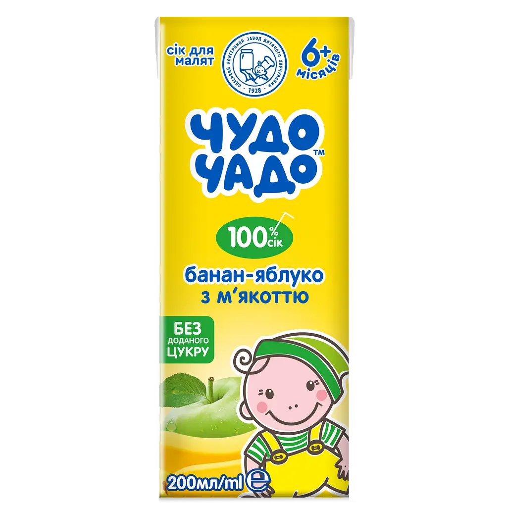 Сік має ніжний, природно солодкий смак — банан додає м’якості, а яблуко легку свіжість, тому поєднання дуже вдале для дітей. Консистенція з м’якоттю приємна, не надто густа, дитина п’є із задоволенням і без дискомфорту. Зручна упаковка з трубочкою добре підходить для прогулянок чи дороги.