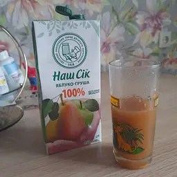 Сік наш улюблений, має натуральний склад(зараз доречі майже не знайти в магазинах 100% натуральний сік) яблучний сік, яблучне пюре та грушеве. Також головний є те, що в складі немає цукру, отже можна давати смакувати дітям. Замовлятиму постійно! Також ціна бюджетна!