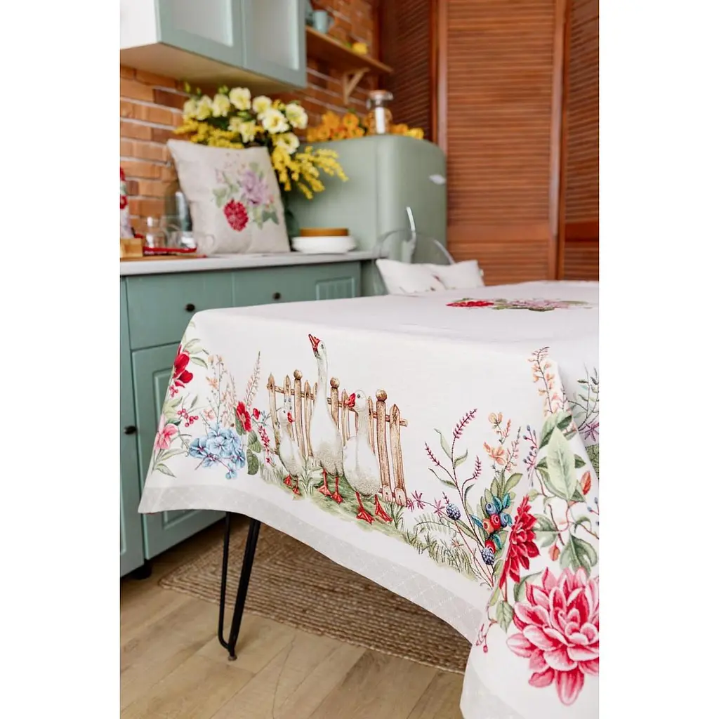 Скатертина на стіл торгової марки Прованс виготовлена з якісної іспанської тканини. Склад тканини: 55% бавовна, 45% поліестер (гобелен). Це стильний подарунок сім'ї, друзям, родичам та колегам на честь світлого свята Великодня.
