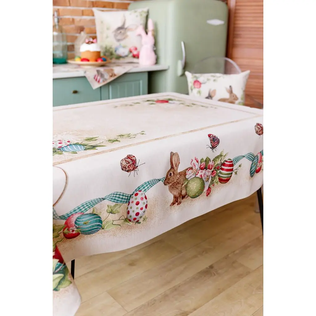 Скатертина на стіл торгової марки Прованс виготовлена з якісної іспанської тканини. Склад тканини: 55% бавовна, 45% поліестер (гобелен). Це стильний подарунок сім'ї, друзям, родичам та колегам на честь світлого свята Великодня.