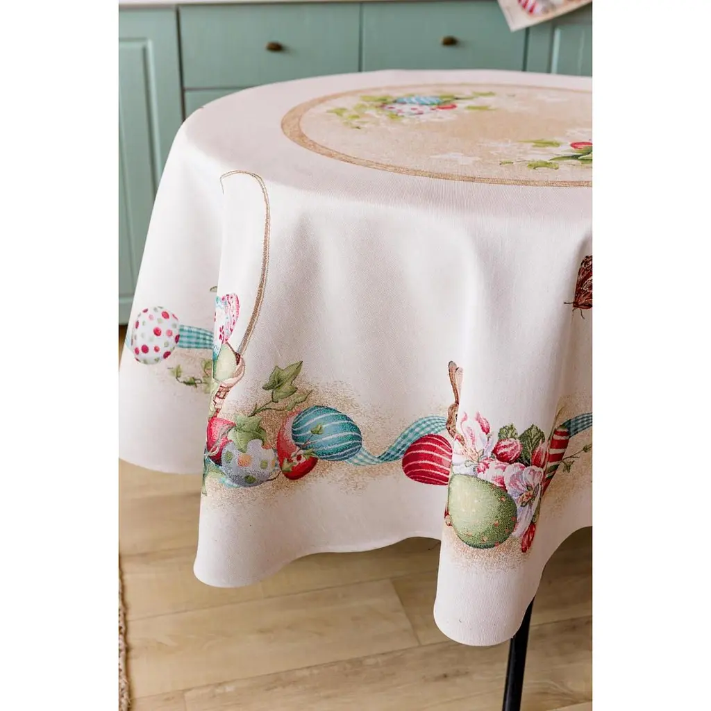 Скатертина на стіл торгової марки Прованс виготовлена з якісної іспанської тканини. Склад тканини: 55% бавовна, 45% поліестер (гобелен). Це стильний подарунок сім'ї, друзям, родичам та колегам на честь світлого свята Великодня.