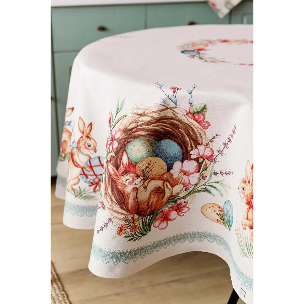 Скатертина на стіл торгової марки Прованс виготовлена з якісної іспанської тканини. Склад тканини: 55% бавовна, 45% поліестер (гобелен). Це стильний подарунок сім'ї, друзям, родичам та колегам на честь світлого свята Великодня.
