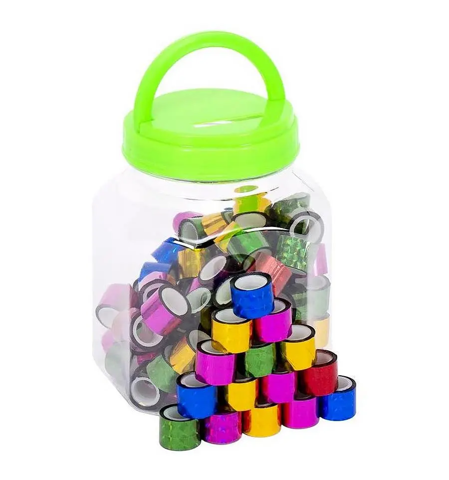 Набір декоративного скотчу. Яскравий із різною тематикою. Відмінно використовують для вклеювання дитячих фотографій, декору книг, кімнатного декору чи подарункової упаковки. Розмір: ширина 1,2см, довжина 2 м. в 1 банці 90 рулонів скотчу.
