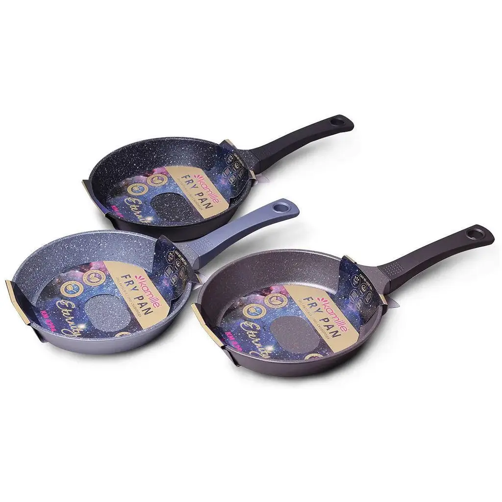 Антипригарна сковорода Kamille - 240 мм Eternity. Завдяки міцному антипригарному покриття така сковорода стійка до механічних впливів, за рахунок чого значно збільшується термін її служби. Сковорода нагрівається рівномірно, не створюючи перегріті ділянки та холодні краї, навіть у тих випадках, коли процес приготування їжі йде на невеликому вогні. В результаті скорочується час приготування страви та зменшується ризик їсти суміш недосмаженої або пересмаженої їжі. Матеріал сковороди: алюміній. Матеріал ручки: бакеліт із покриттям soft-touch. Внутрішнє покриття: антипригарне "Space stars" Діаметр: 24см Висота: 5см