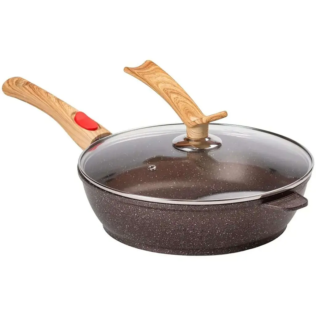 Сковорода діаметром 28 см - універсальний варіант для приготування різноманітних страв. Посуд виготовлений з литого алюмінію, добре проводить тепло та забезпечує рівномірний прогрів інгредієнтів. Сковорода має
